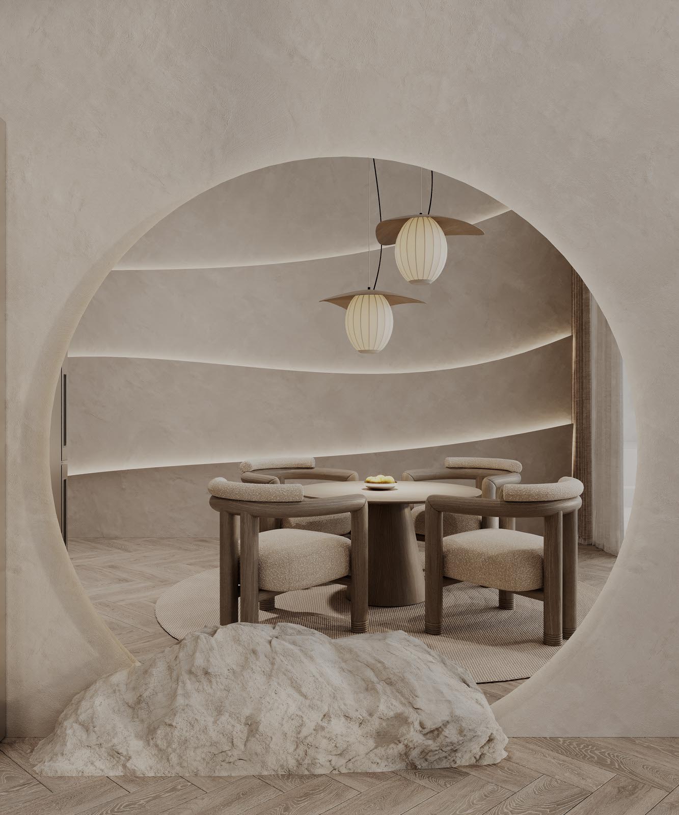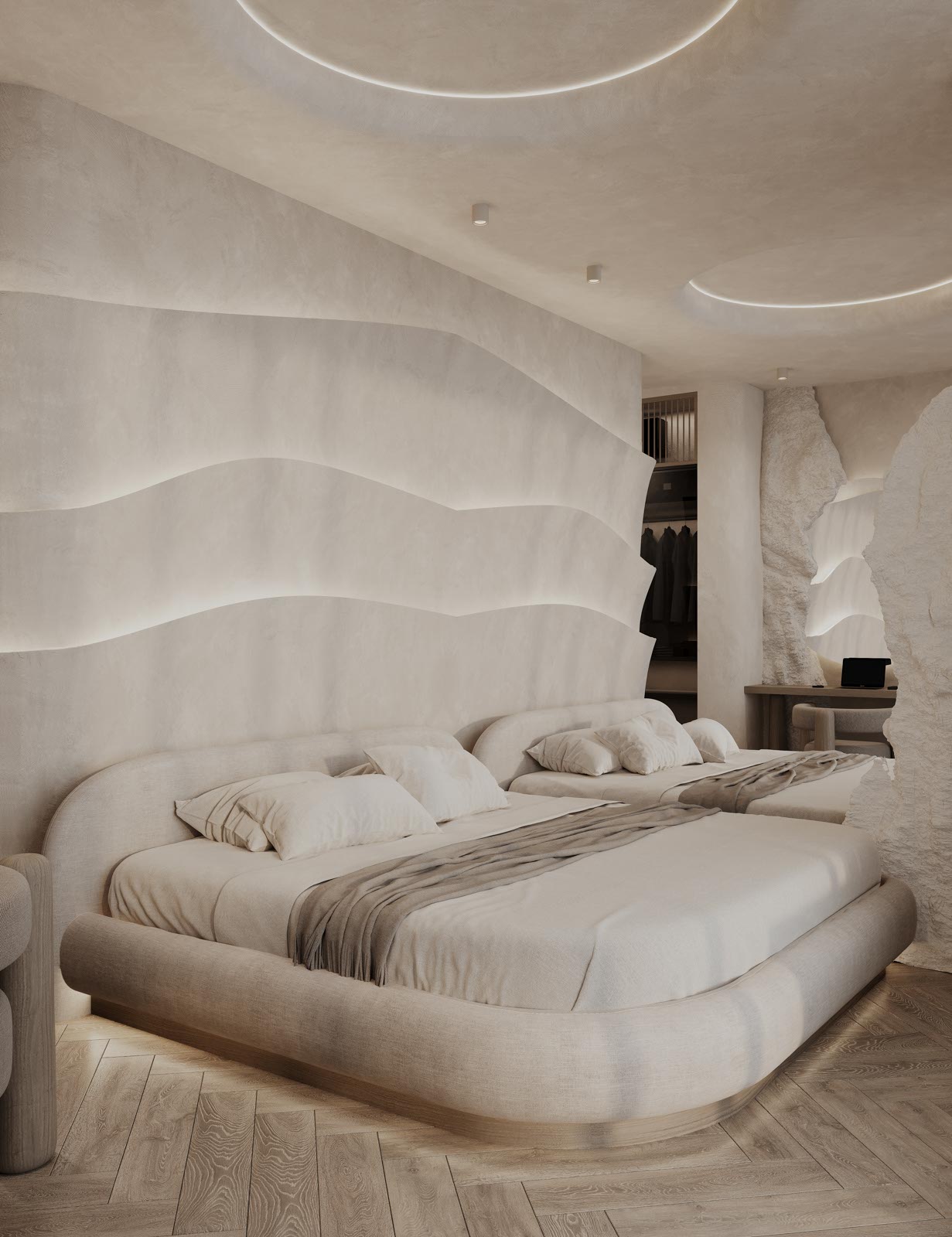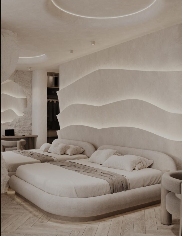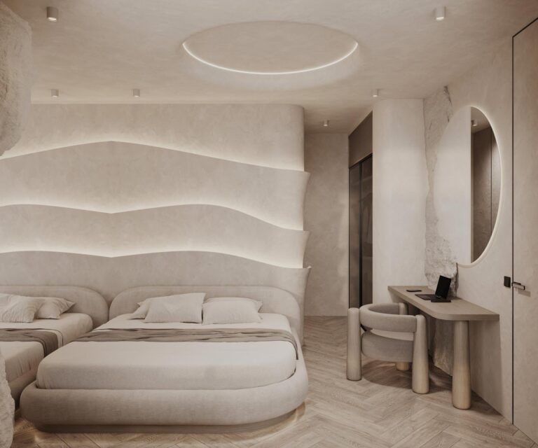 A Cove apartman különlegessége a kivételes belmagasság, melyet egy hullámzó plafon határol, s e hajlított tér különleges hangulatot ébreszt az apartman vendégeiben. A falat díszítő áramvonalak selymes fényű ledvilágítást rejtenek, melyek különleges kontrasztot alkotnak a törtfehér, barlangot imitáló kőfelületekkel.