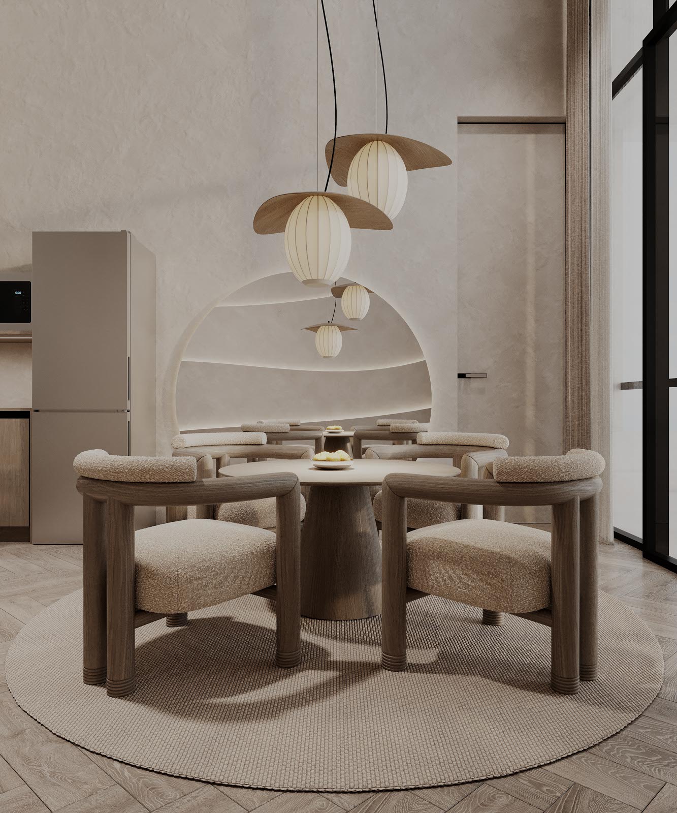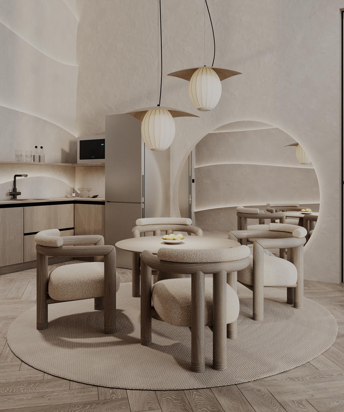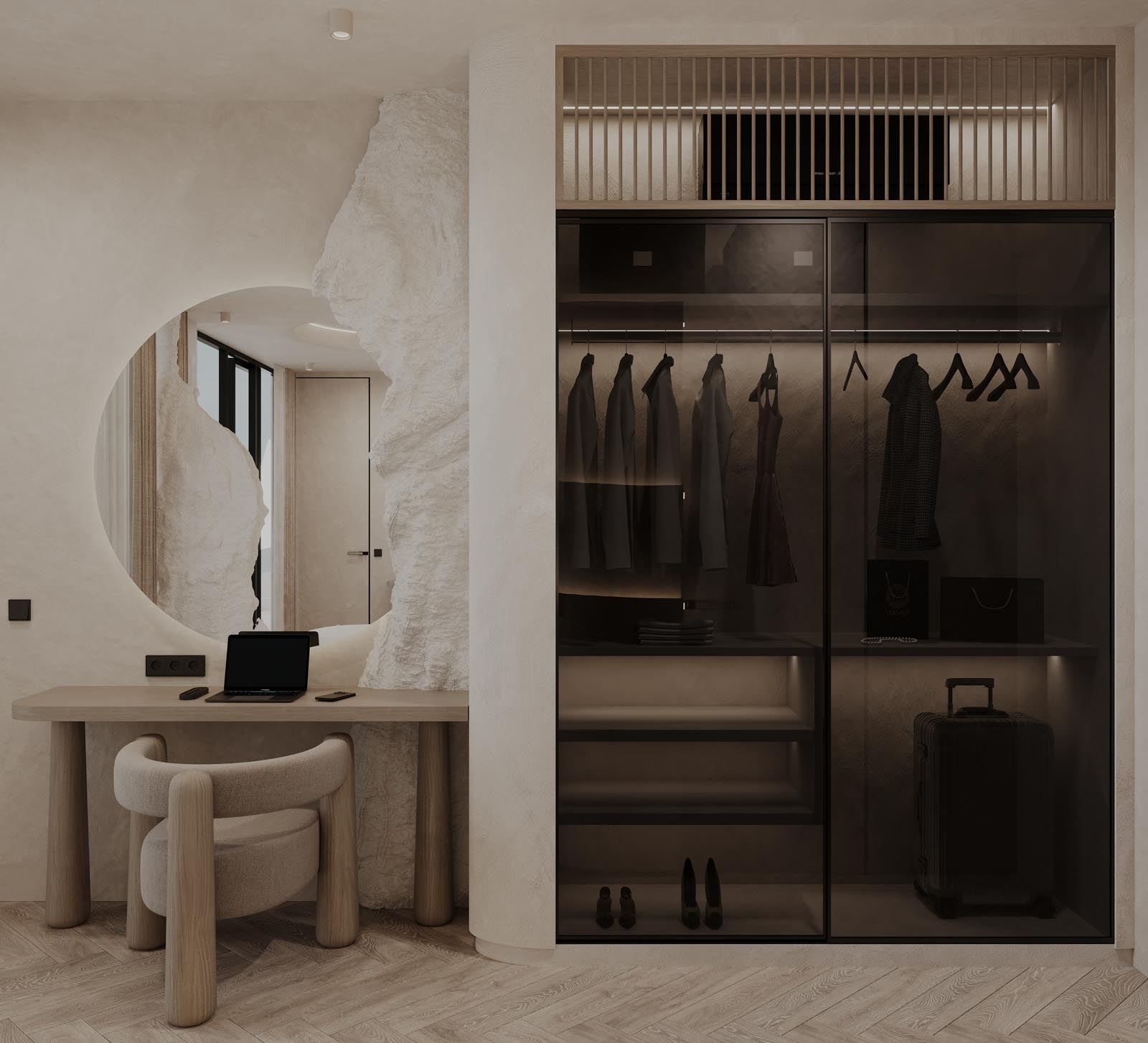 A Cove apartman különlegessége a kivételes belmagasság, melyet egy hullámzó plafon határol, s e hajlított tér különleges hangulatot ébreszt az apartman vendégeiben. A falat díszítő áramvonalak selymes fényű ledvilágítást rejtenek, melyek különleges kontrasztot alkotnak a törtfehér, barlangot imitáló kőfelületekkel.