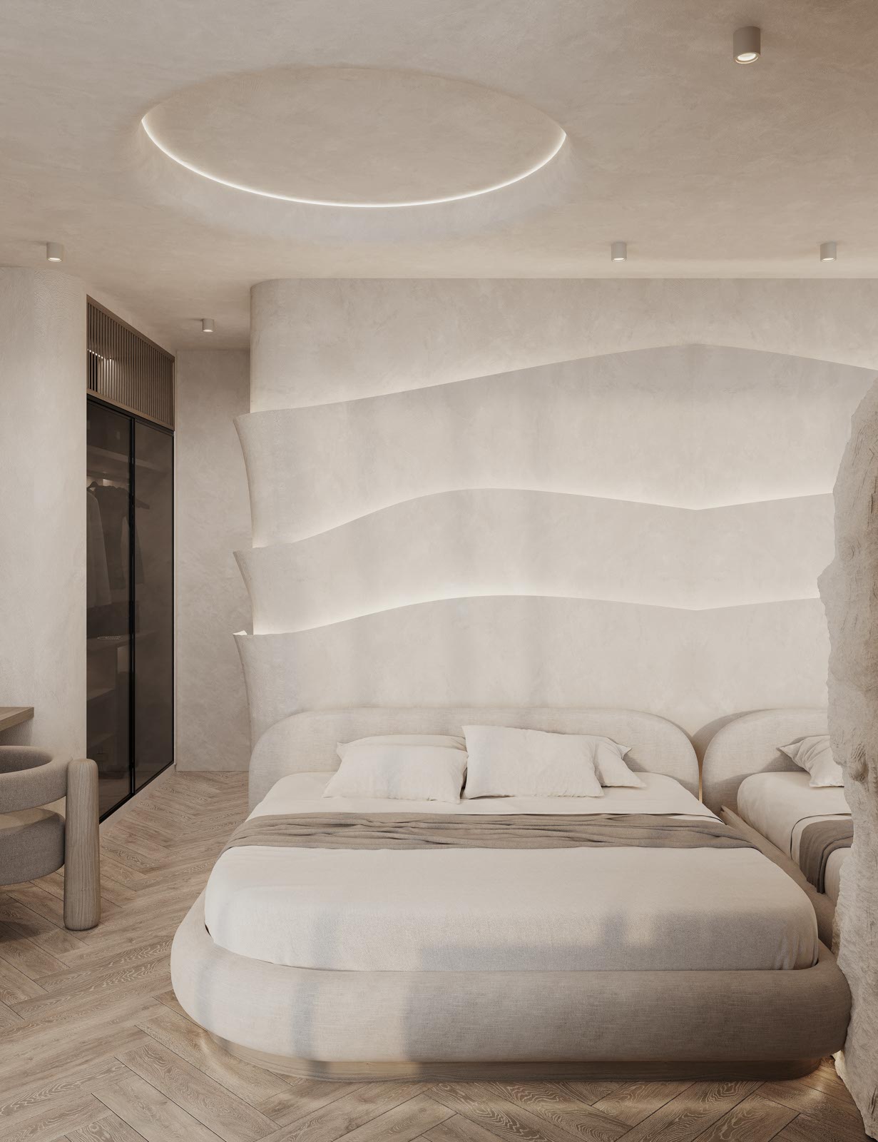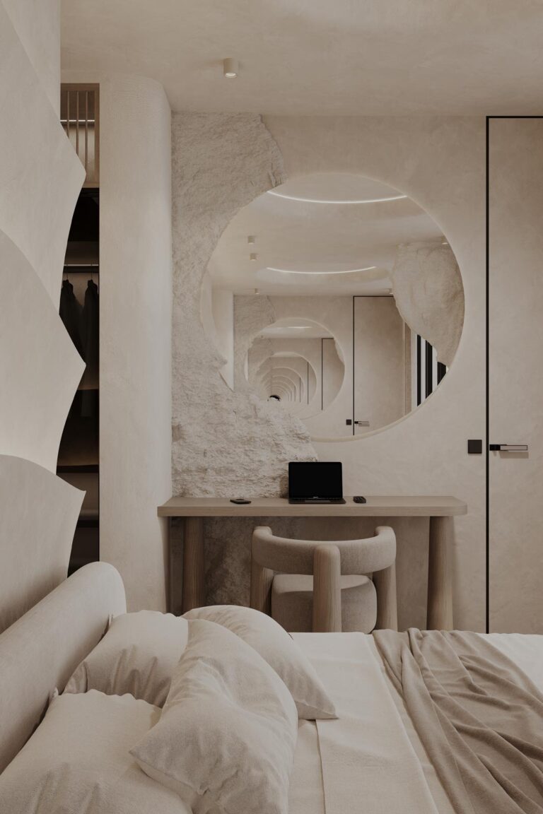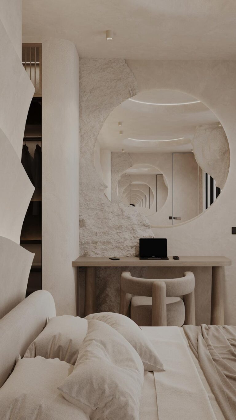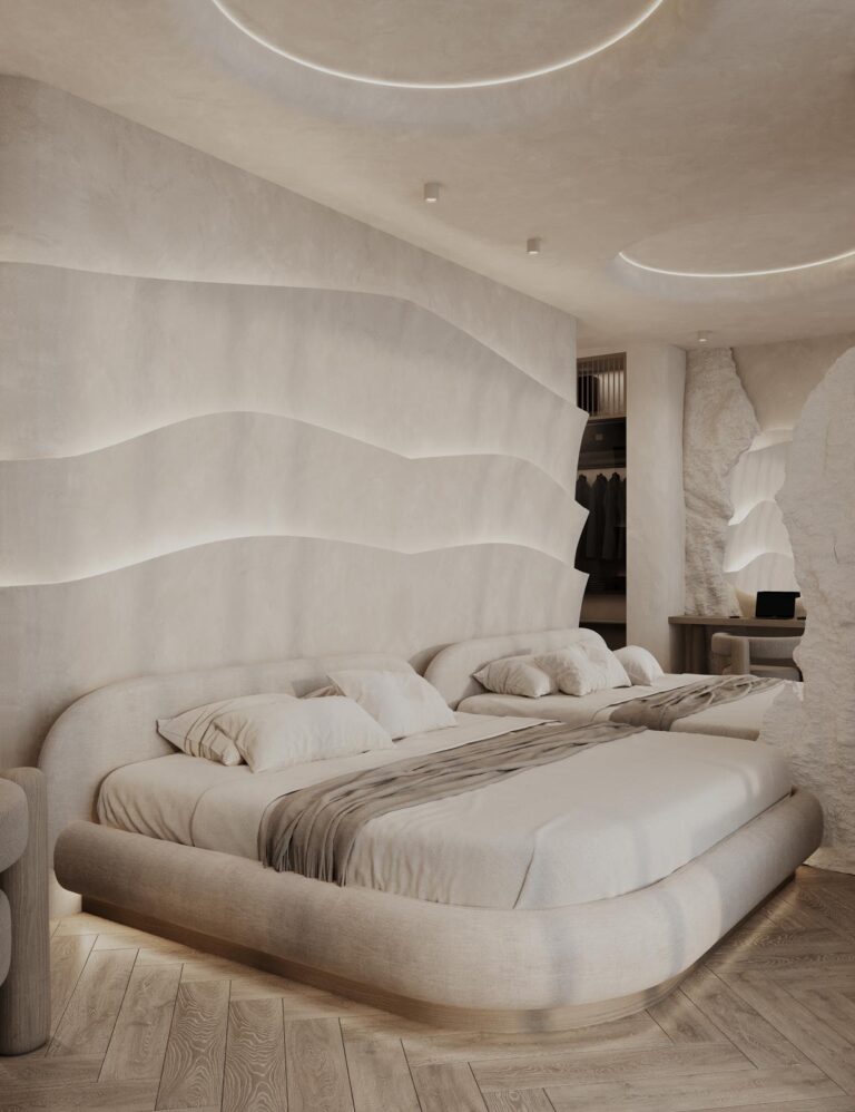 A hálószobákban szintén a grotto stílus és a mennyezetig érő tükör teremt különleges atmoszférát. A fürdőszoba elegáns aprócsempés designja és erősen hajlított terei itt is a különlegesség, az alkalmiság érzését erősítik.