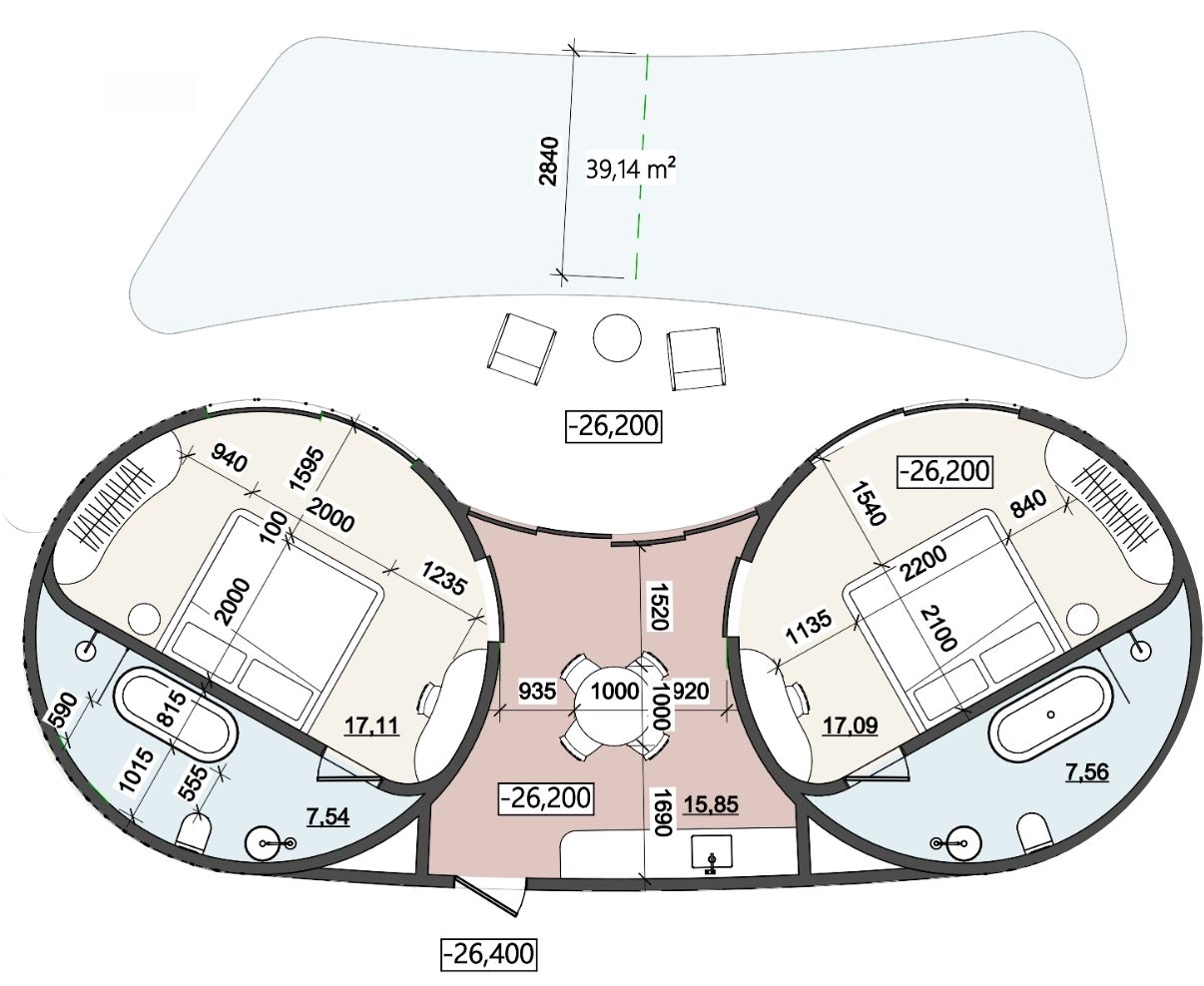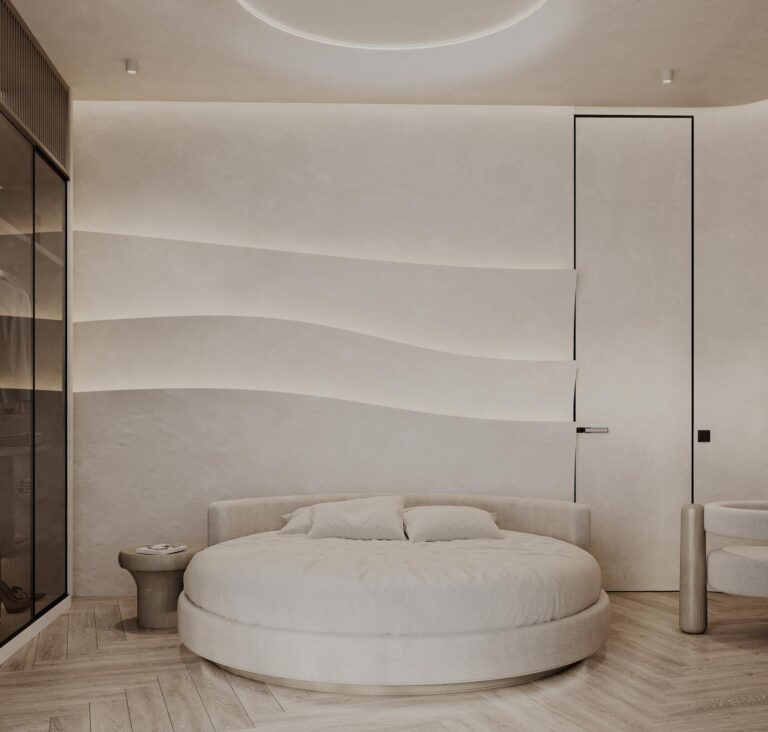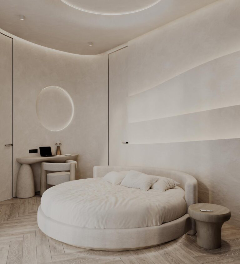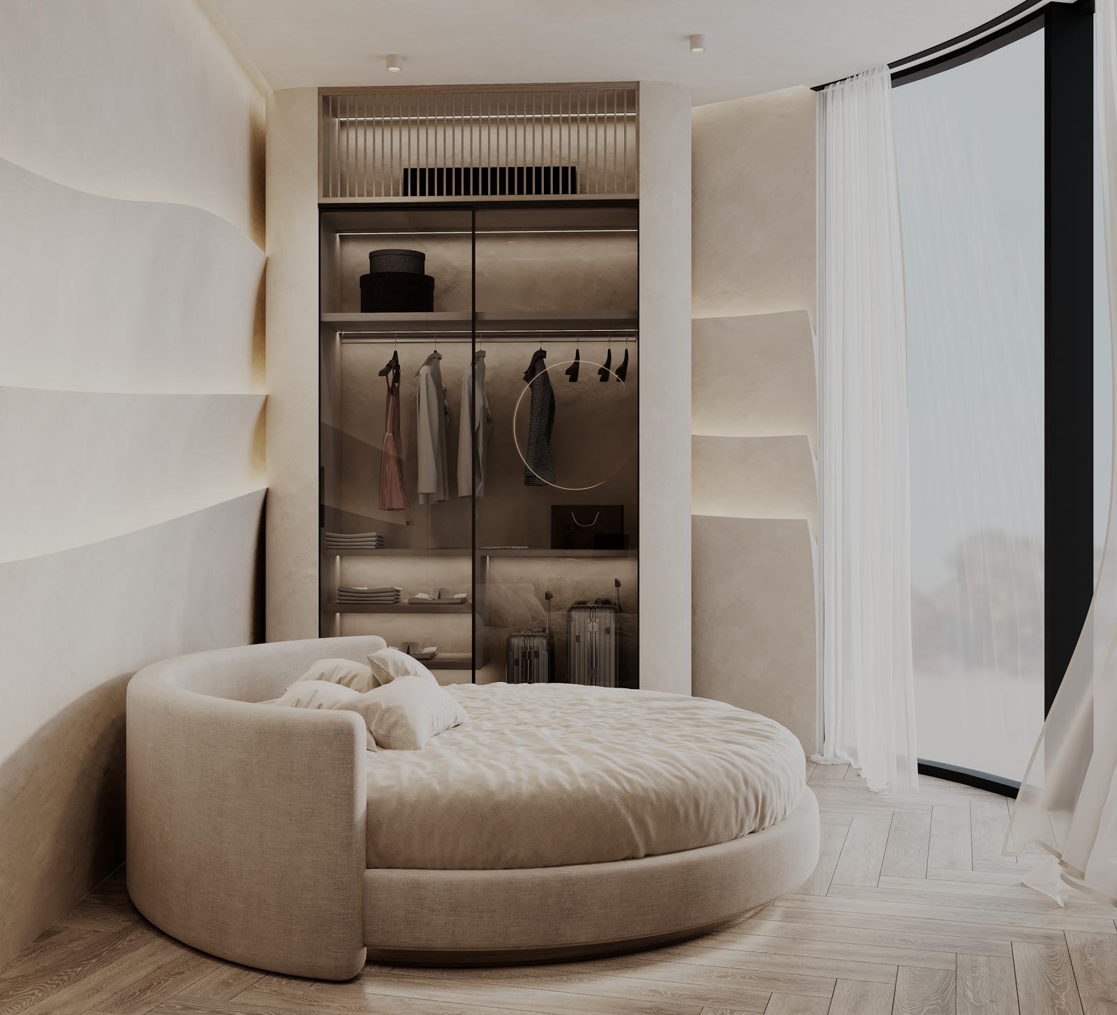 A középpontban egy kerek franciaágy helyezkedik el, mely tökéletesen harmonizál a szoba ívével. A hatalmas, padlótól a mennyezetig érő ablakfelületek háborítatlan kilátást kínálnak az óceánra és a saját medencére, melyet akár az ágyból is élvezhetünk. Az elegáns, sötétített üvegű beépített szekrény bőséges pakolóterületet kínál, a szemben lévő falon pedig egy dolgozópult / sminkasztal is helyet kapott. A falat díszítő áramvonalak selymes fényű ledvilágítást rejtenek, melyek különleges kontrasztot alkotnak a törtfehér, barlangot imitáló kőfelületekkel.